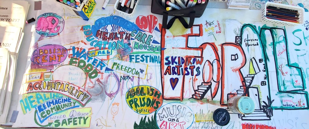Image: “FOR ALL” an unfinished Doodles banner started at 16th Annual Festival for All Skid Row Artists, Oct 2025.