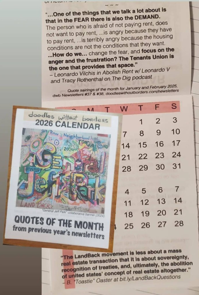 They all appear in the Doodles 2026 “Quotes of the Month” calendar zine, and all can be political consciousness raising entry points for anyone!